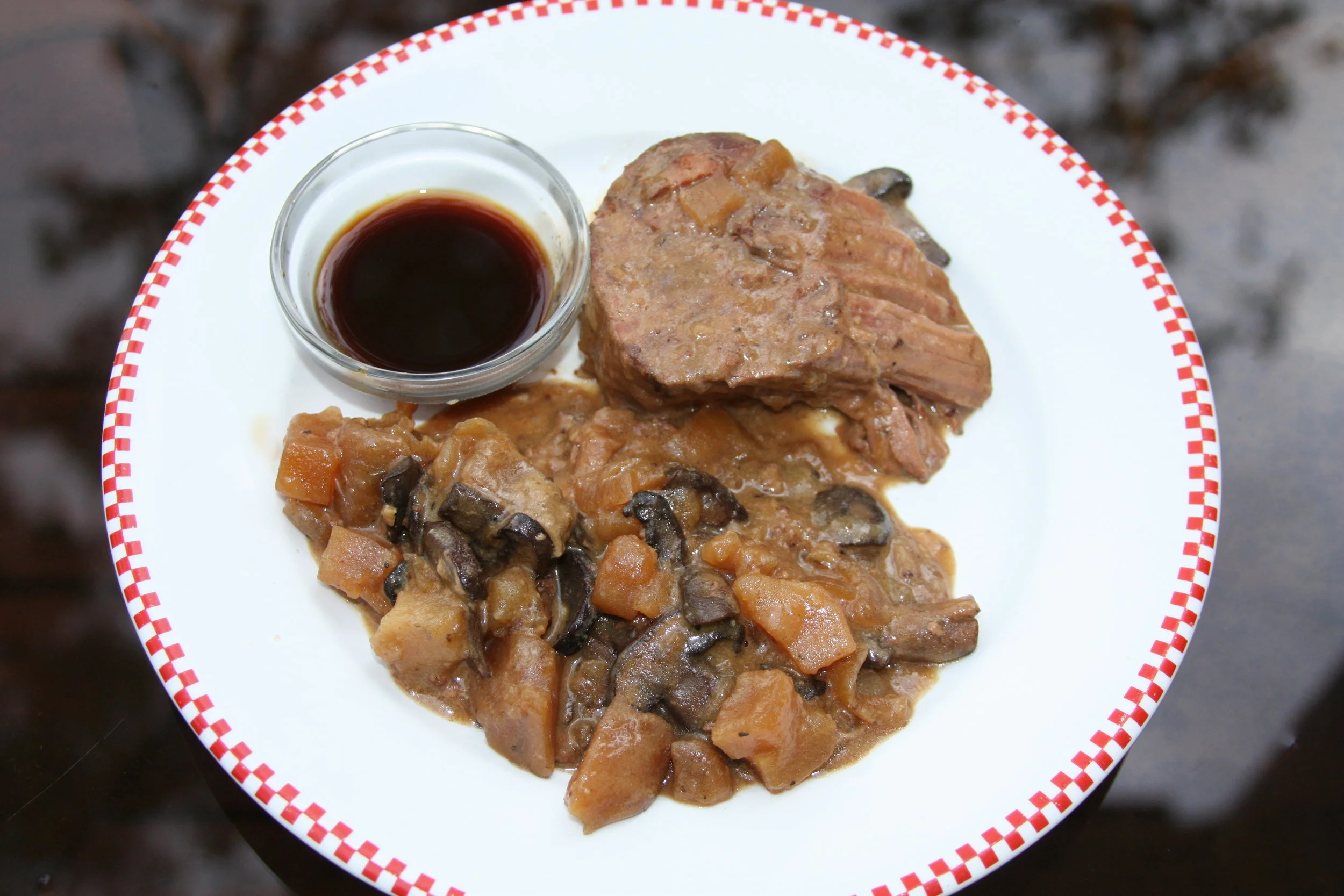 In a large bowl, mix the garlic, mushrooms, potatoes and onion. After being mixed well, pour half into the bottom of the crock pot. Stab the shoulder roast with a fork multiple times all over, season with Montreal steak seasoning, lather with Cream of Mushroom soup, then add to crock pot. Be sure to use ALL of the Cream of Mushroom soup to fully cover the shoulder roast. Add 4 oz of KBK sauce. Pour the rest of the garlic, mushrooms, potatoes and onion in the crock pot. Cook on low for 8 hours (recommended) or high for 4 hours.